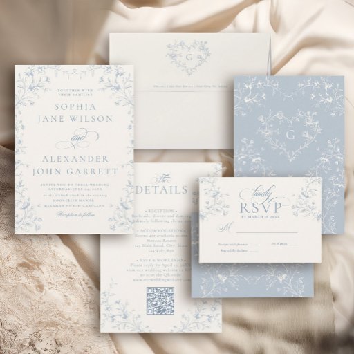 Complete your timeless wedding invitation suite with this Classic French chinoiserie RSVP card. Featuring delicate blue botanical florals, romantic calligraphy, and refined Victorian typography, this elegant response card offers a traditional and heirloom-inspired way for guests to reply.