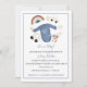 Cute baby blue boy shower invitation with toys, shirt and gingham background.