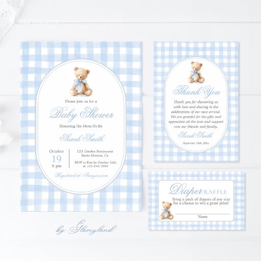 Blue Gingham Bear Baby Shower Boy Inbjudningar