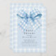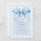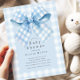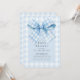 Gratulerar till att din lilla flicka kommer att komma med vår charmerande blåa gingham-buskduschinbjudan. Den här snygga designen har en coquette-butik som ger lite elegans och stollig och som perfekt fångar glädjen från detta speciella tillfälle. Gör din bebisdusch oförglömlig med denna förtjusande och snyggt inbjudan som återspeglar kärlek och förväntan på ditt nya glädjeslag.