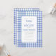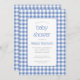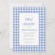 Den här babyduschinbjudan har en rustik blå och vit gingham-kontrollerad bakgrund. Texten visas i en vit rektangel med ett tunt blått gräns och rundade hörn, med ord "babydusch" och namn i mamma till att börja med i en charmerande blå typografi och den återstående texten i grått sans serif-teckensnitt. Perfekt för en pojkes babydusch. Gingham mönster upprepas på kortets baksida.