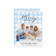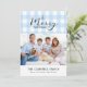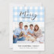 Klassisk ljusblå gingham med God jul hälsning. Utrymme för 1 vågrät foto och personligt meddelande på framsidan och året på baksidan.