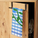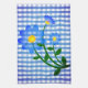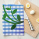 Kökshandduk med en bukett av blåa blommor mot en blå och vit gingham-bakgrund.