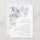 This elegant wedding invitation features AI created white 3 dimensional blue and gold flowers on a white background.