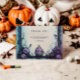 Inbjudan gäster till ett häpnadsväckande vackert första födelsedagsfirande med denna gotiska violettdesign. Med skuggade blommigtar, fladdermus cuptårta och vintage skalldetaljer är det perfektens val för en Halloween baby party med en mystisk elegant-vibe. Fullständigt anpassade till kostym för din händelse.