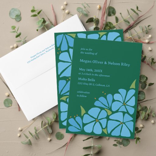 Stora, feta, himmel-blå stiliserade blommor mönster. Blått Groovy Flower Mönster bröllopsinbjudan.