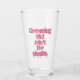 Lustigt dricksglas läser, i ett traserat teckensnitt, GROWING OLD AIN'T FOR SISSIES. Visar i rosa brev. Designat för att föra in lite humor i den åldrande processaa.