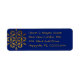 Blå och guld returetiketter. Den här etiketten har plats för upp till fyra linjer text, vilket är ett handtryckt teckensnitt som justeras mot den lämnat.