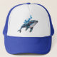 Traditionella vattenfärgsbilder av en blå färgad hump val som simmar längs en truckerkeps.