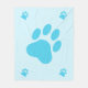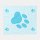 Enkelt stort blått tass-silhuett i mitten och mindre tass i hund i vardera hörnet av filten. Bakgrunden färg är ljusblå.