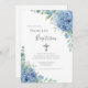 Blue hydrangeas on a white background beautiful religious baptism invitation. A beautiful and elegant invitation for any season. Beautiful coordinating holy cross in the center of this beautiful design. Simply lovely. The watercolor hydrangeas are just stunning. Classy & chic.