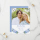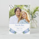 Förvänta dig ett elegant trädgårdsbröllop med den här känsliga blommigten spara datumet. Två blommor blåser i grund i kortets hörn och ger en mjuk blå text. Du kan anpassa kvadratfotot ovan. Baksidan har ett starkt blått färg med ett minimalistiskt, modernt motiv. En perfekt för ett vår bröllop.