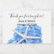 Mini mousserande vin flaska-etiketter för ett bröllopsmottagningsbevis. Blå vattenblommor och vit stjärnfisk med två ställe för text. Säg "tack" till gästerna i bröllop och lägg till datum för namn och bröllop. Vita etiketter med blåa blommor och ett strandtema. Utformningen kan passa på andra märkningsstorlekar.