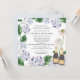 Modern blommigt har ljusblå vattenblommor och vit ros. I mörk grönt löv skapar de ett frihandsfigur gräns på denna vattenfärg inbjudningskort för möhippan. Hela texten kan redigeras. Den ingår i samlingen Blue Hydrangea Vit ros som innehåller inbjudningskort för möhippan-förråd och party-förråd.
