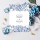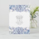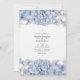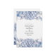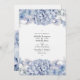 Blått kort för bröllopsinbjudan. Det finns dahlias, chrysanthemum och ro.