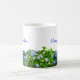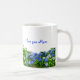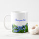 Jag kärlek er Mamma blå vattenområden mugg. Hydrangea buskar/shruber som växer i trädgården är bilden längs grund med blå text på båda sidor.