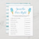 Glasögonbabyduschen "gissa den prisa högerna" med en vattenfärgad illustration av blått och mynta glasskrämer på en våffelkon. Texterna kan redigeras. Perfekt att spela under duschen. Den räknar upp det viktigaste baby och ber gästerna att gissa det prisa. Den som gissar prisa vinner närmast!