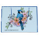 En blå kajfågel omgiven av rosa, lila och persikopastellernas färgad vår blommor mot en ljusblå bakgrund.