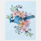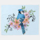 En blå kajfågel omgiven av rosa, lila och persikopastellernas färgad vår blommor mot en ljusblå bakgrund.