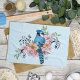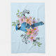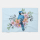 En blå kajfågel omgiven av rosa, lila och persikopastellernas färgad vår blommor mot en ljusblå bakgrund.