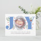 Blue Joy med bär Första julfoto Helgdag pojke födelsemeddelande. Den visar ord "JOY" med röda bär och grön vind medan brev "O" där är ditt foto. Baksidan innehåller blått polka dots.