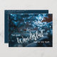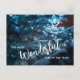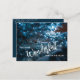Ett vackert Julgran som är täckt av snö återspeglar kvällens blå ljus och har "Den underbara tiden på året" på framsidan av dessa vykort för helgdag och din personliga Julhälsningar och logotyp på baksidan.