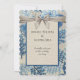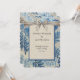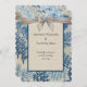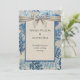 En vacker bröllopsinbjudan Blue löv på en grått-linne-hessisk bakgrund med en elegant grått-band över ett mörk blått ram