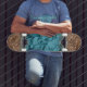 Skateboard har en enastående blå marmorerad utformning med guld glitter på vardera änden.