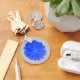 Den här nyckelkedjan för söt innehåller ett foto av en marigold blomma som har manipulerats för att göra den till ett häpnadsväckande blått färg. Blomman sitter på en grått-bakgrund.