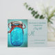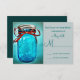 Blue Mason Burk Rustic Landsbyggsbröllop OSA kort med ett vibrant akvblått burk med bränd orange rödaktig båge på ena sidan. På baksidan av det OSA svarskortet står "OSA" på en fast akvblått bakgrund.