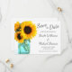 Solros bröllop spara datum. Konstruktionen har solblommor i gult i burk på blå mason på vit bakgrund.