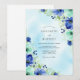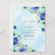 This design features a wash of ethereal sky blue watercolor as a backdrop for vibrant botanical elements. Lush blue anemones with dark centers are paired with delicate mint green foliage and clusters of small berries. The palette of navy, aqua, and soft green creates a refreshing and romantic atmosphere for a seasonal ceremony.