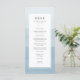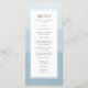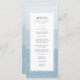 Blå Modern Bröllop-menyn. Den här vackra och elegant dammiga blå bröllop-menyn har en vattenfärgsmålad ombre-bakgrund med vit gräns. Baksidan av inbjudan har samma blå vattenfärgsbakgrund. Sök efter matchande objekt i samlingen Dusty Blue Watercolor Ombre Bröllop.