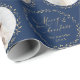 Christmas gift wrapping paper feature modern Merry Christmas script and botanical leaves wreaths, with personalized family name and 6 photos in navy blue and gold, simple and elegant.