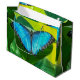Butterfly Blue Morpho mot bakgrund av gröntens blad och gultens ljus.