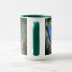 Dekorativt mugg i blått, rosa och grönt färg. Vackra Butterflies Blue Morpho mot bakgrund av att blomma ro nära vatten.