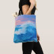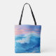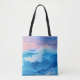 Blå brytare rullar mot en strand när sol sätter sig i färg av rosa och lavender. Det här är perfekten till väskan för alla som kärlekar stranden eller havet.