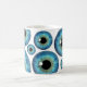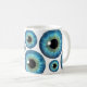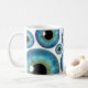 Blue Öga Iris © Sunny Mars Design. Coola, roligt anpassningsbar tryckte blåögda, klassiska mugg med ett trendig, modernt, vackert, unikt, fräckt, läskigt, konstig och vriden grafik som illustrerar en iris av en stor, blå, realistisk ögonboll i öga. Andra ögonbalformar från färg finns också i lager.