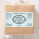 A blue parchment paper style label with a vintage frame and vintage styling for soaps, cosmetics, and other toiletries. This label contains space for your product name, business name, product weight, ingredients, instructions, social media, and business address. This label measures 3.75 inches by 2 inches (95 mm by 51 mm) and is suitable for bottles with a diameter of 1.2 inches (31 mm) or more such as 4 oz (120 ml) bullet, cylinder, and boston round bottles. It can also be used for cosmetic jars and other types of cosmetics packaging.