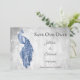 Anpassa ett unikt bröllop-meddelande med ett Blue Peacock Save the Date. Meddelandedesign har en elegant-påk mot ömtålig lövning och grym bakgrund och text som du kan anpassa med dina datumuppgifter i bröllop. Ytterligare spara datum meddelande som är tillgängligt för den här konstruktionen i en mängd olika färg.