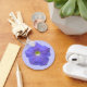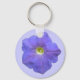 Den här söt nyckelkedjan har ett foto av en blå petunia med skuggor av lila och ett vitt centrum på en vacker blå bakgrund