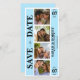 Blått bröllop spara datum-kort med fotobågshölje av bild-typ. Anpassa med dina personliga uppgifter om bröllop och nyritade foton av par.