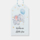 Playful, adorable elephants held blue balloons in their trunks and surrounded gold stars.