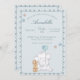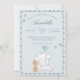 Den här inbjudan till babyduschen i anpassningsbarna innehåller en söt illustration av stil i vattenfärgen. En liten pojke-elefant bildas vid grund med en blå hjärtformade ballong. En stapel av alfabetblock placeras framför honom. Bakgrunden är ett blått färg.