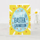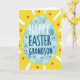 This design shows a large sky-blue oval in the middle, dotted with lighter blue spots that give it a soft, bubbly look, with a sunny yellow field around it that feels like a warm embrace between friends 🌷. Thick white rays stretch outward from the oval into the yellow area, like a gentle burst that frames the message with extra attention. Small glossy orange circles are sprinkled across the yellow border and inside the blue oval, like little treats scattered for a shared celebration 🐰. Centered inside the oval, the word “HAPPY” sits near the top in bold white letters. Below it, “EASTER” appears in dark blue, set larger and steadier so the eye lands there next. Near the bottom, “GRANDSON” is written in dark blue with curled letter shapes, adding a tender, affectionate touch to the layout. A small circular accent sits near the upper right of the oval, while the orange dots and white rays continue to ring the bright yellow background.