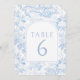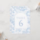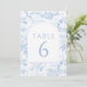 Klassisk elegant blue chinoiserie porcelain inspirerade blommönster boho arch vår eller sommar bröllop bordsnummer med brud och groom namn.