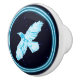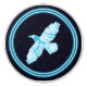 En enkel, glödande, blå och vit linjebild av en Raven (Corvus corax) på en stjärnbakgrundsbild.