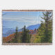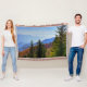 Ett bergslandskap i bergstrakter i bergstrakter som rullar backe och som är försett med ett kraftigt fall och skapar en färgstark tapehäst mot de avlägsna, mist täckta topparna. Tall evergreen träd ram i förgrunden och djupet läggs till i andningsvyn.