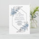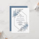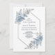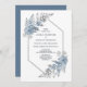 En elegant blå och silver botanisk bröllopsinbjudning med öppna löv och daisy som hålls av en enkel faux glitter-trådram. Både ceremonin och mottagningsinformationen för adress har tagits med i inbjudan.