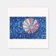 A colorful aerostatic hot air balloon seen from below sits against a deep blue, starry background. The design is vibrant with red, white, and blue segments, surrounded by scattered small yellow and white accents.